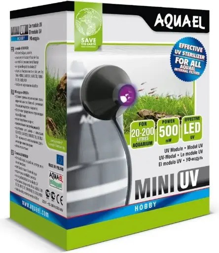 AQUAEL MINI UV is a unique device. It has the form of a short sleeve that is installed on the outlet of the filter. Four energy efficient UV emitting LEDs are located in its interior, effectively sterilizing the water flowing out of the filter. It is adapted for cooperation with all lines of internal AQUAEL filters (FAN, UNIFILTER, TURBOFILTER, PAT MINI). It perfectly removes algae from the water preventing it from greening. It kills pathogenic bacteria protecting the fish from diseases. It also destroys protozoa that cause water clouding.
