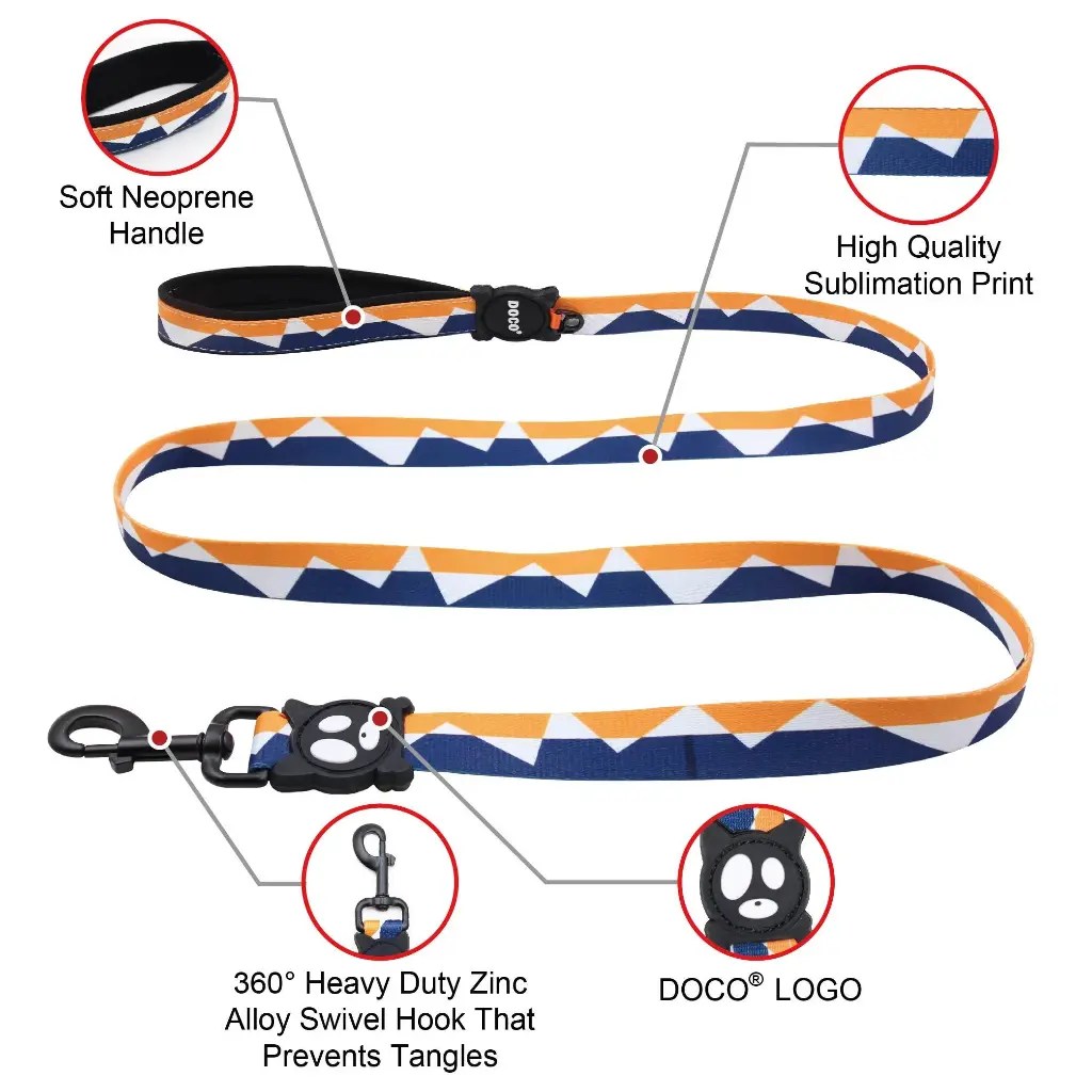 DOCO® LOCO Eco-Friendly Heat Transfer Design Dog Leash are designed with our LOCO dog logo. Features soft, fray resistant and designed for generous hand loop for walking, hiking and running with NEOPRENE HANDLE. LOCO loves the crazy and fashionable patterns, unique hardware and fully welded black anodized metal parts. The eco-friendly prints are colorful and fun.Black finished zinc alloy durable metal 360° swivel hook is comfortable to snap on any dog collar or harness.