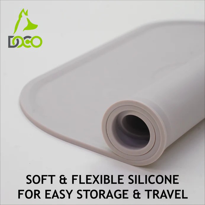 DOCO ® silicone pet food mat elevated edge to keeps all the mess contained on the pet food mat and away from your floor. Use this cute waterproof mat for food and water under pet food bowls for dogs, water dishes, pet fountains, automatic feeders, feeding stations to protect your floors. You can even use it for your cat or other pets. Our dog bowl mat is easy to wipe with a wet cloth or wash by hand and it is dishwasher safe. If you are traveling or just visiting friends, you can just roll it and take it with you.