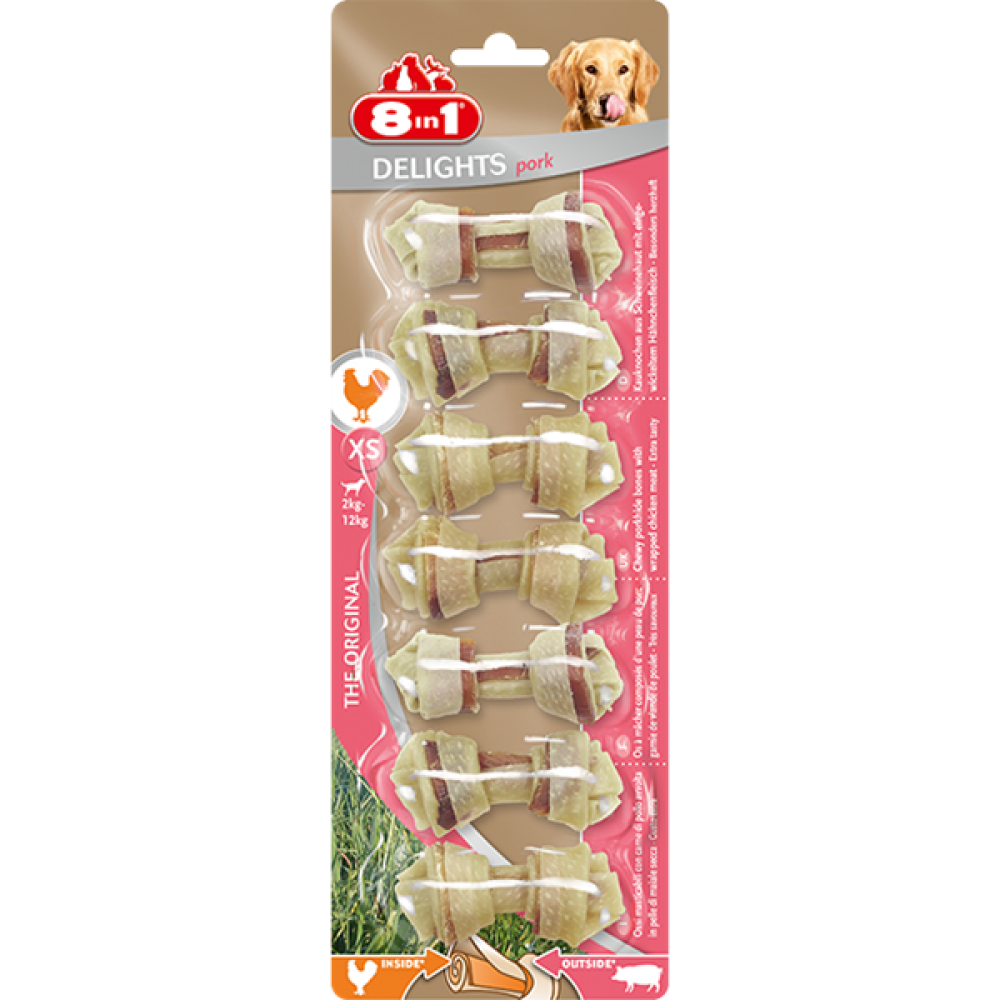 Recommended for adult small breed dogs (2-27kg)A chewy bone made from pork hide with wrapped chicken meat. This deliciously succulent combination keeps your dog busy and offers intensive chewing pleasure Long-lasting chewing fun whilst enhancing dental care 6% fat. Free from artificial colours and flavour enhancers