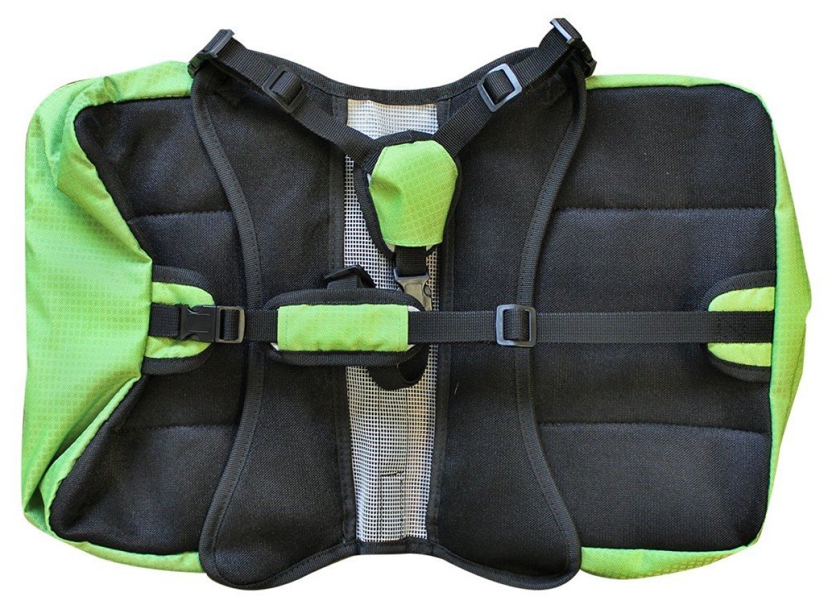 Multi-pocket, padded, breathable dog backpack with waste dispenser.