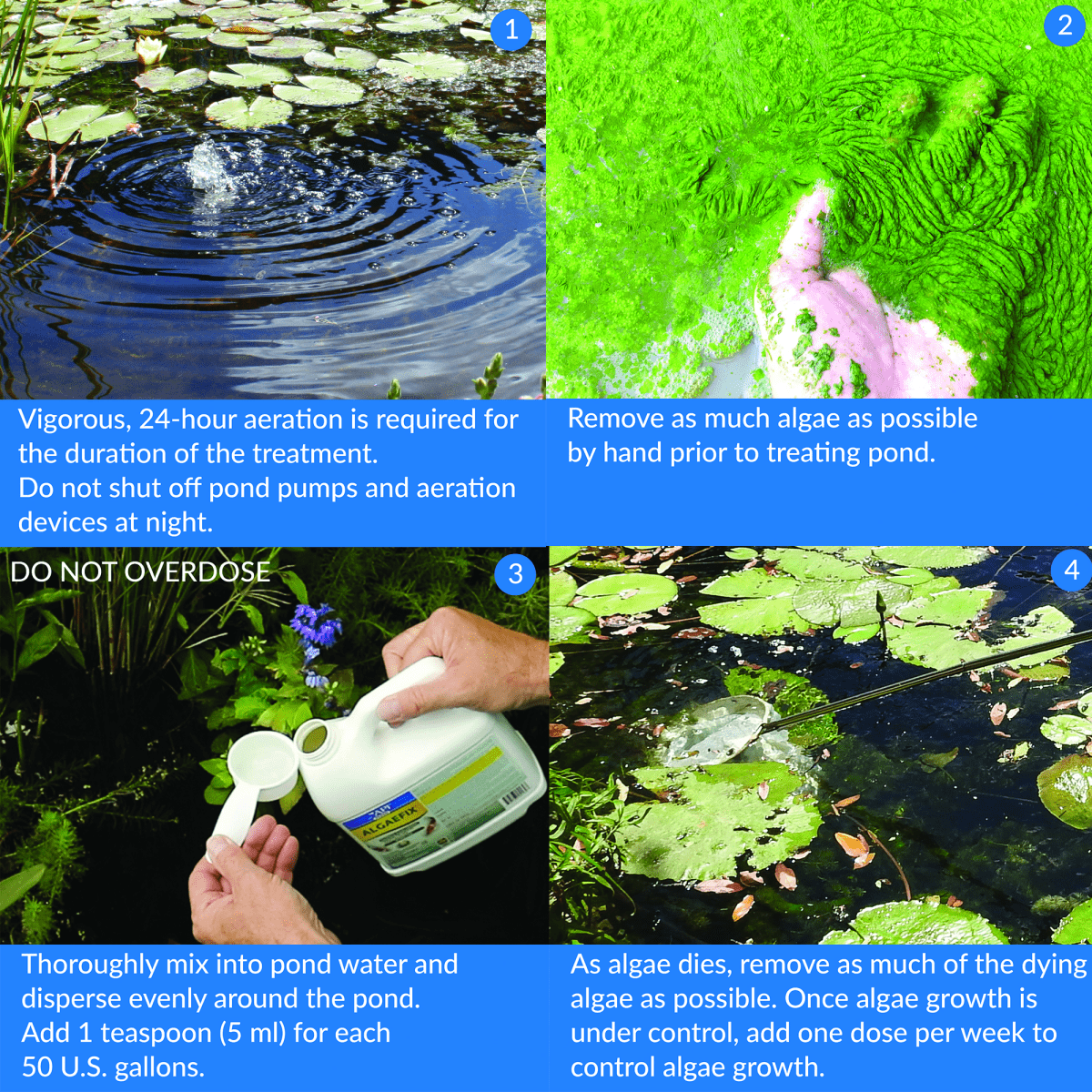 To ensure accurate dosing, determine pond volume before use. Do not overdose. Add 1 teaspoon (5 ml) for each 50 gallons or 0.25 cup for each 600 gallons of pond or fountain water. Thoroughly mix into pond water by adding near the pump outflow, waterfall, or aeration device. It can be mixed in a bucket and dispersed evenly around the pond. Repeat dose every 3 days until algae is controlled. Once algae growth is under control, add one dose per week. Weekly doses will control algae growth and reduce pond maintenance.