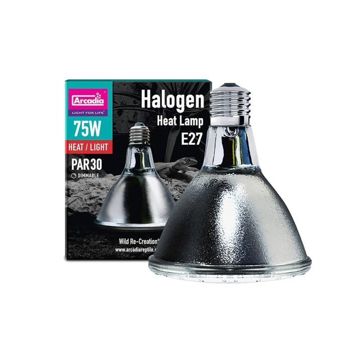 Standard halogen basking lamp for focused heating zones to assist reptile thermoregulation.