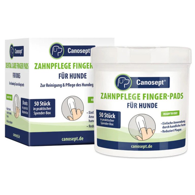 Canosept Dental Care Finger Pads enable effective cleaning of the dog’s teeth and ensure good oral hygiene. They reduce the formation of plaque and promote fresh breath. With the specially developed finger pad, the pet owner intuitively follows the shape and movement of the dog’s dentition during cleaning. Canosept Tooth Care Spray is recommended as a supplement.