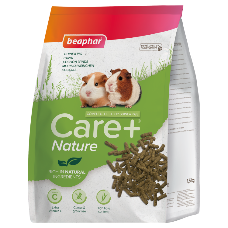 Keep your guinea pig in optimal condition naturally with Beaphar Care+ Nature. This tasty premium feed is rich in natural ingredients such as Timothy hay, herbs and grasses to meet the nutritional needs of your guinea pig. Its high fibre content promotes their digestion, and the specially hardened pellets support the natural wearing of their teeth. It contains natural prebiotics to stimulate beneficial gut bacteria and Yucca schidigera to reduce faecal odour. It is enriched with vitamin C and contains no cereal and grains, no added sugar or colourants.