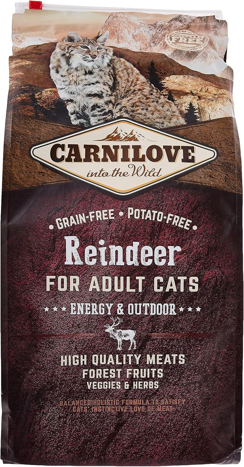 🦌 Carnilove Reindeer for Adult Cats – 6kg 🥩 Wild-Origin Protein for Active Cats Carnilove Reindeer for Adult Cats is a grain-free and potato-free dry food formulated to meet the nutritional needs of adult cats with access to the outdoors. It contains 28% reindeer meat meal and 28% wild boar meat meal, providing a rich source of high-quality protein essential for muscle development and overall health. 🌿 Natural Ingredients for Optimal Health Enriched with a blend of natural ingredients, this formula supports your cat’s health and well-being: Yellow peas (18%) – A source of plant-based protein and fiber for digestive health. Chicken fat (13%) – Provides essential fatty acids for skin and coat health. Chicken liver (4%) – Rich in vitamins and minerals for overall health. Salmon oil (2%) – A source of omega-3 fatty acids for heart and joint health. Apples, carrots, flaxseed, chickpeas – Provide vitamins, minerals, and antioxidants for immune support. Hydrolyzed crustacean shells & cartilage extract – Sources of glucosamine and chondroitin for joint health. Brewer’s yeast, chicory root, yucca schidigera, algae, psyllium, thyme, rosemary, oregano – Support digestive health and provide natural antioxidants. Cranberries, blueberries, raspberries – Provide antioxidants for urinary tract health.