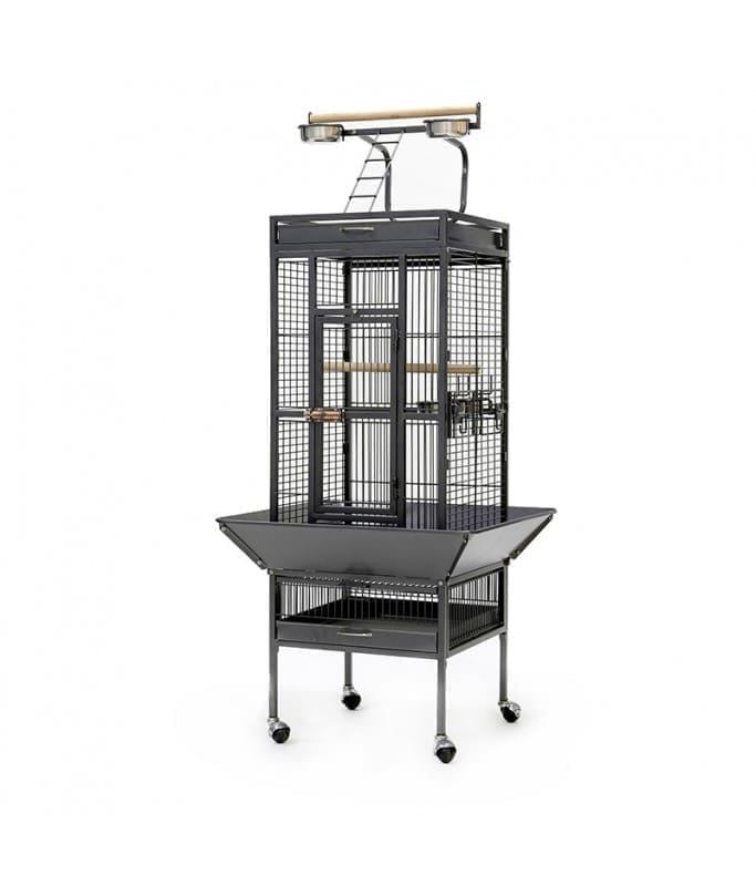 This lovely cage features a perch on top with two stainless steel feeding bowls. It also includes additional perches and feeding bowls inside, along with a slide-out tray that makes cleaning much easier.