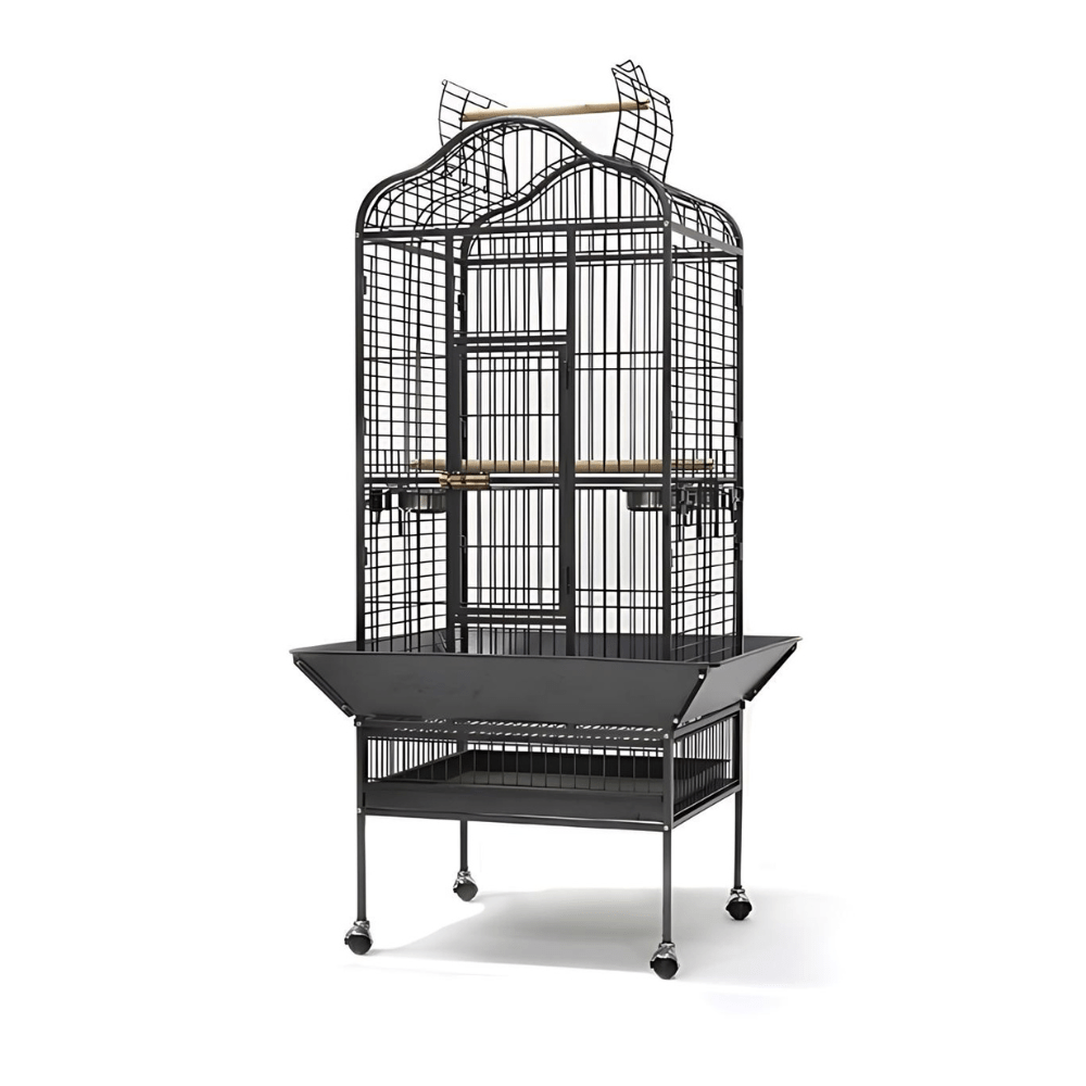 This lovely cage features a perch on top and includes perches and stainless steel feeding bowls inside, as well as a slide-out tray that makes cleaning much easier.
