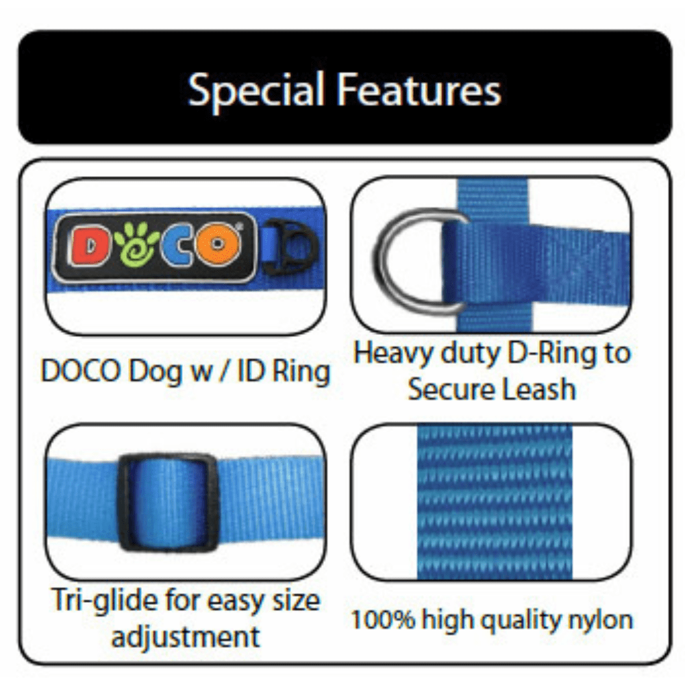 DOCO® Signature Nylon H-Harness features soft, fray resistant nylon. Provides more comfortable fit and less pressure around neck than classic collars for easier training and outdoor activities. Plastic side buckle on the chest strap that quickly clicks shut and stays put. Designed with adjustable tri-glides on both the neck and chest straps for fast adjustment and custom fits for different girth sizes. Heavy-duty stitching for lasting quality and metal D-Ring for secure lead. Solid and vibrant colors are easy to see.