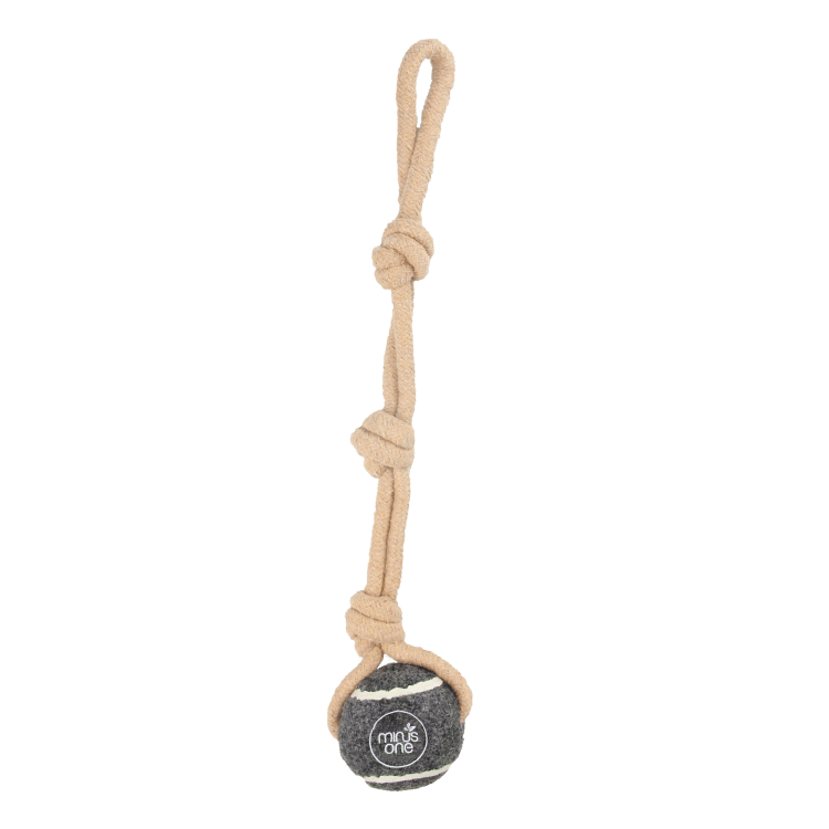 Dog toy combining a tennis ball and a rope for tug and fetch activities.