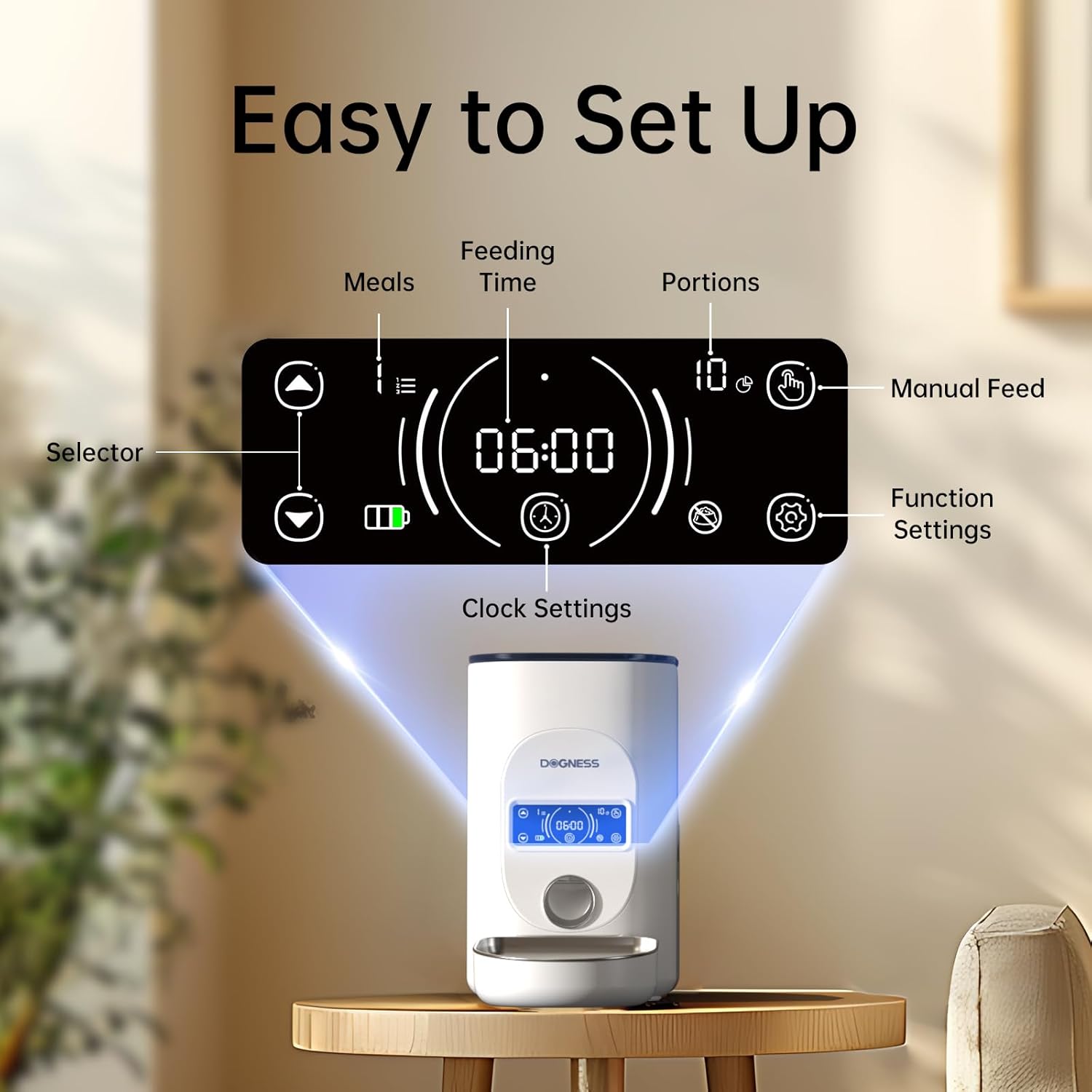 - 5000mAh Battery Operated: Dogness wifi pet feeder Built-in 5000mAh rechargeable Li-Ion battery that can last feeding up to 60 Days when fully charged. No need to prepare D-type batteries, which is convenient and less costly.Also no worry about your pet chewying the cord.