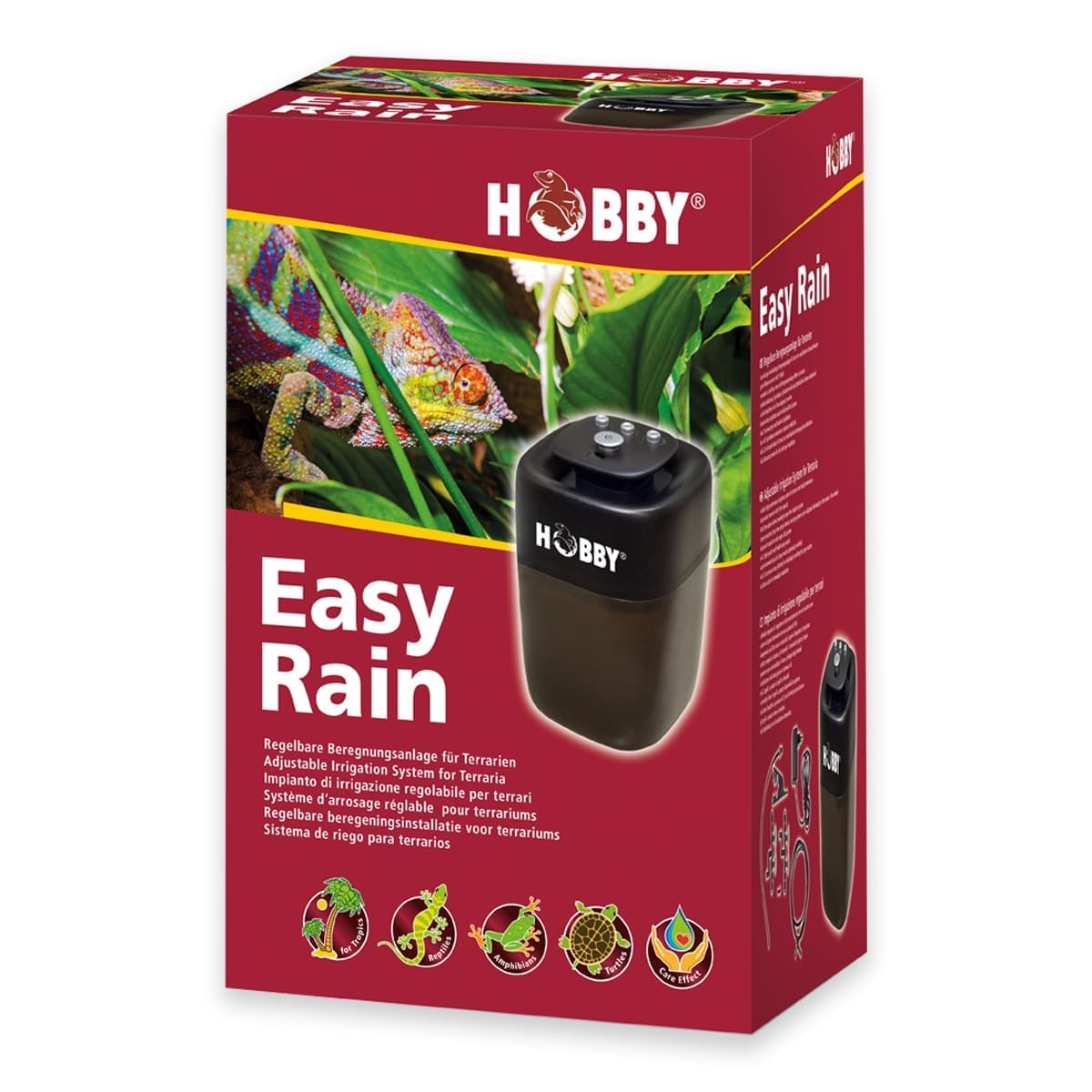 The Easy Rain is a modern and reliable high performance irrigation system. Ideally suited to supplying your terrarium and its inhabitants and plants with the necessary moisture. The large water reservoir with 9 litre capacity is even enough to provide moisture to larger terraria or small greenhouses for continuous operation over several days. And here the water reservoir can be easily filled from above through an opening without opening the irrigation system. The Easy Rain can be extended by up to 6 nozzles. As such, several terraria can be supplied with moisture at the same time. You can adapt the spray time and spray intervals individually to your needs. For small terraria, the spray power can also be easily adjusted to stop it from raining too much. The spray nozzles included spray the water in a fine mist like in nature. This way you can effortlessly achieve the desired humidity in your terrarium. This stimulates the vitality of the tropical inhabitants and promotes their breeding behaviour. The right terrarium climate also plays a big role in the growth of terrarium plants like mosses, bromeliads or orchids. With the Easy Rain you can create THE perfect climate in your terrarium! incl. hose cutter / 5.5 m pressure hose 4/6 mm / fine filter / 2 spray nozzles / end piece / 9 litre water reservoir.