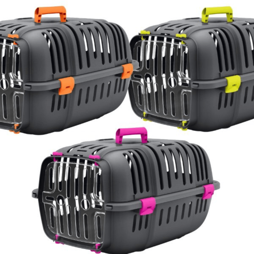 Carrier for cats and small dogs. Anti-scratch plastic with bright coloured elements.