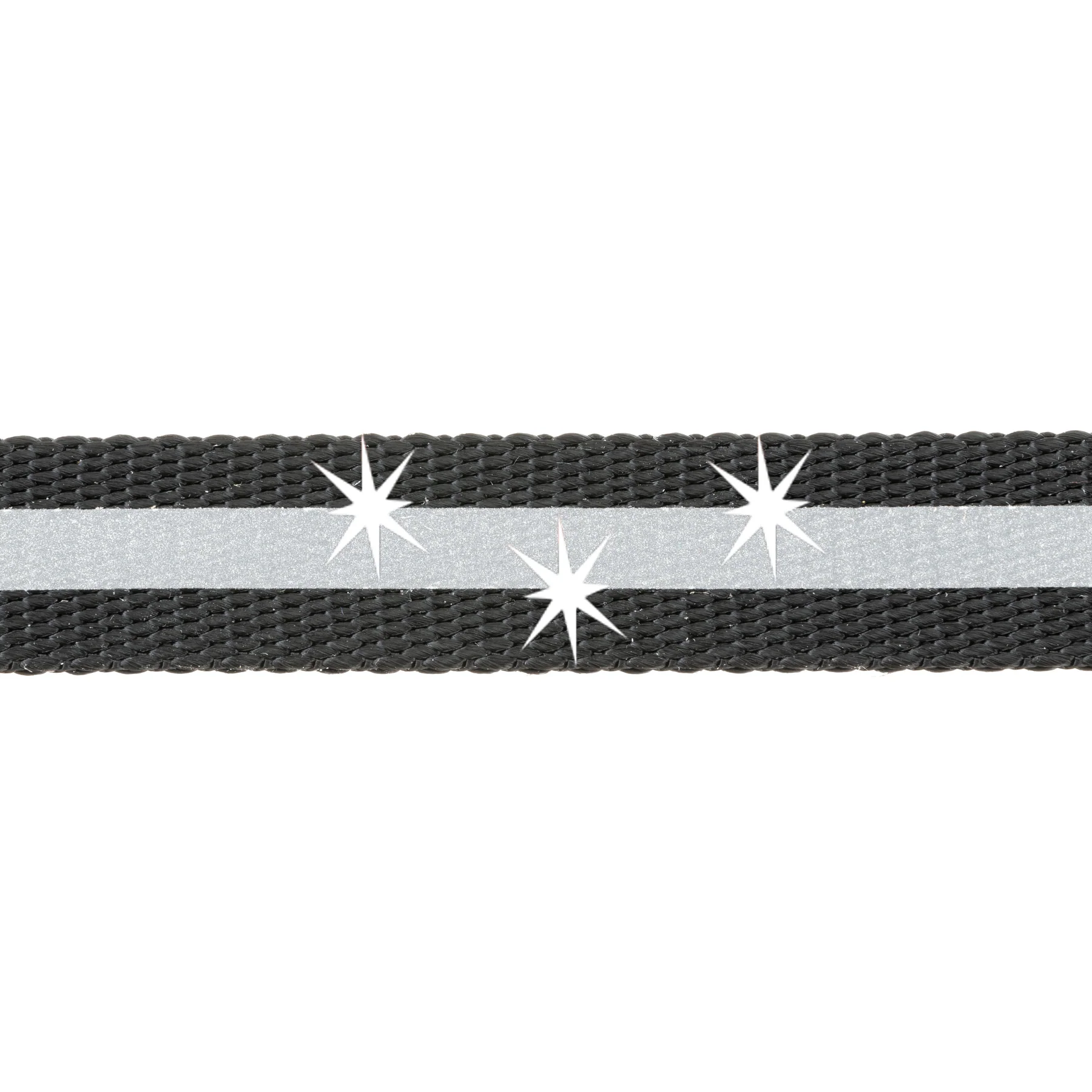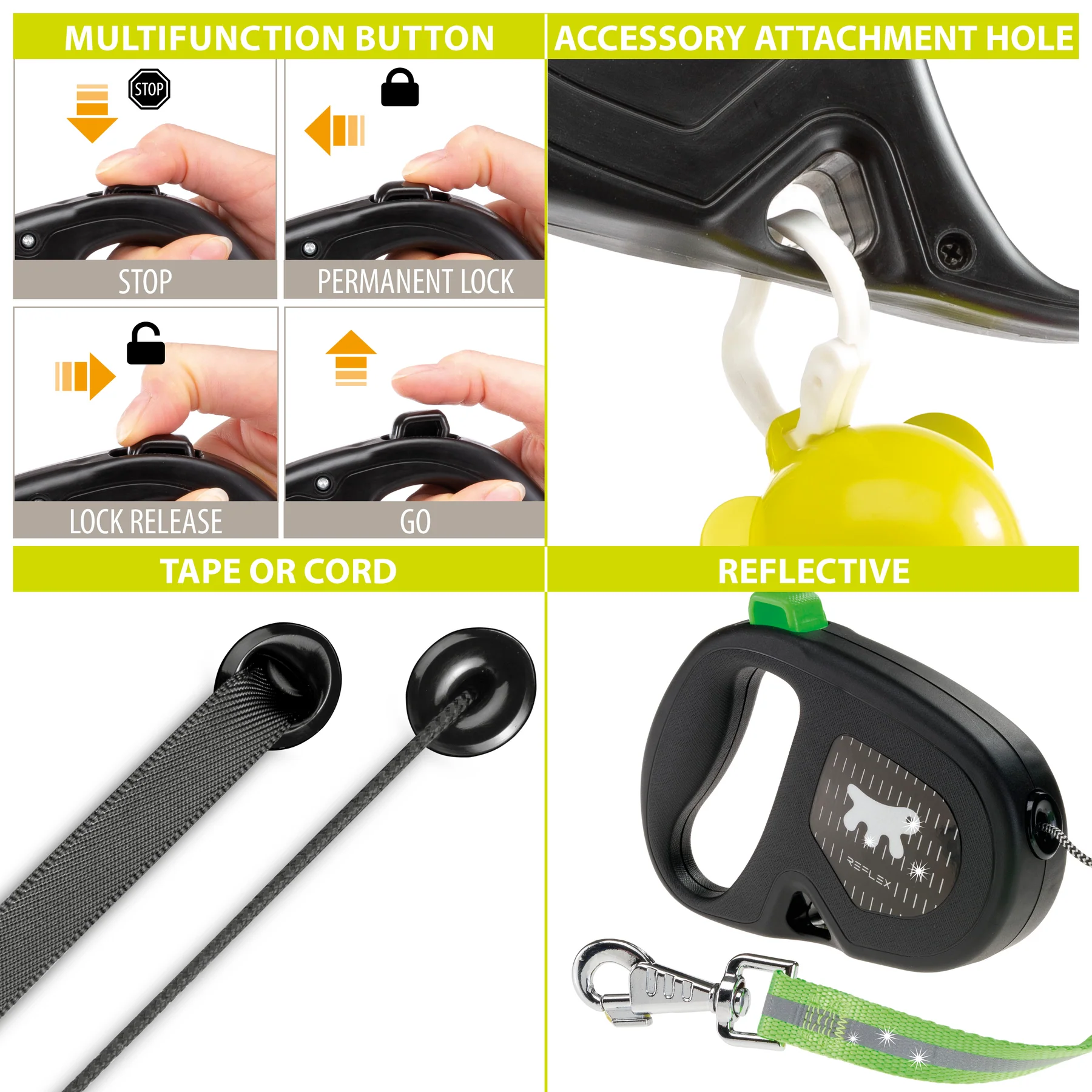 Reflective retractable dog lead. Extensible tape. Integrated hygienic bag holder.