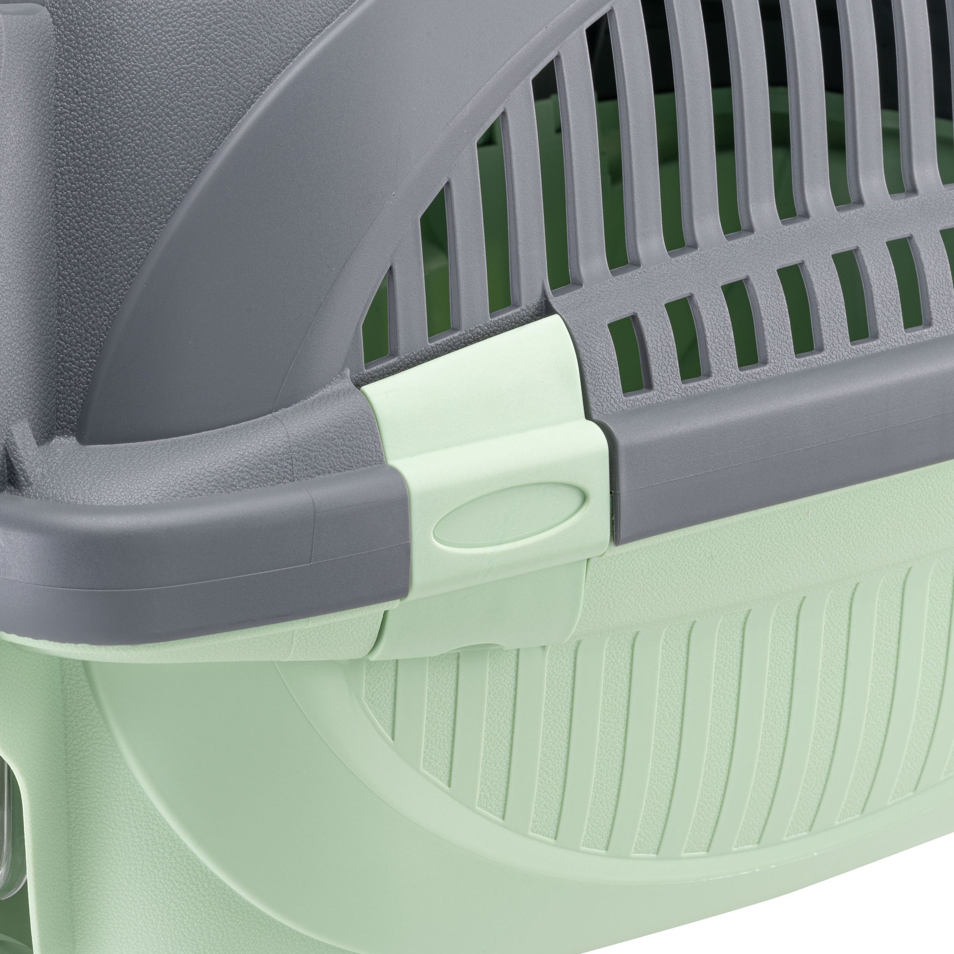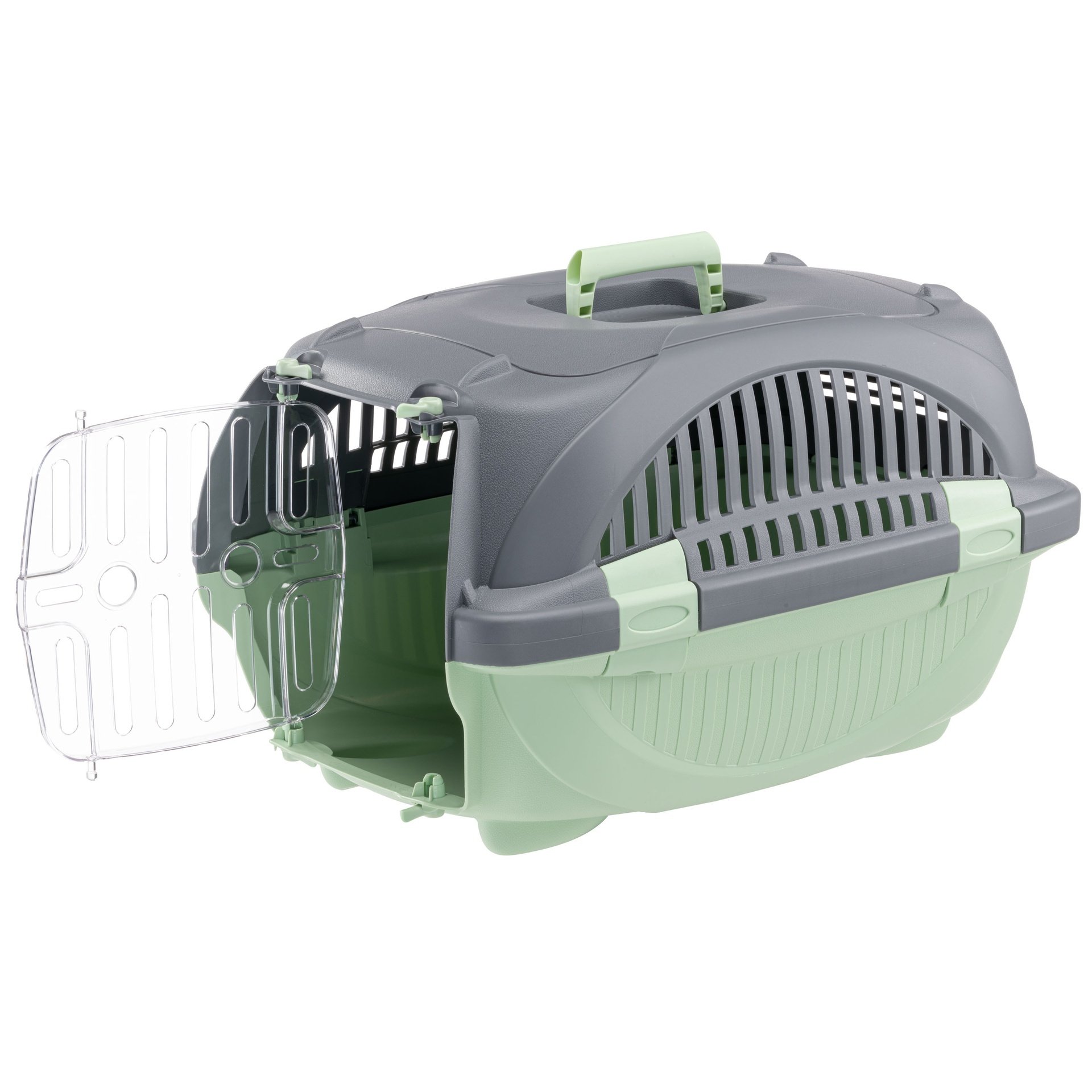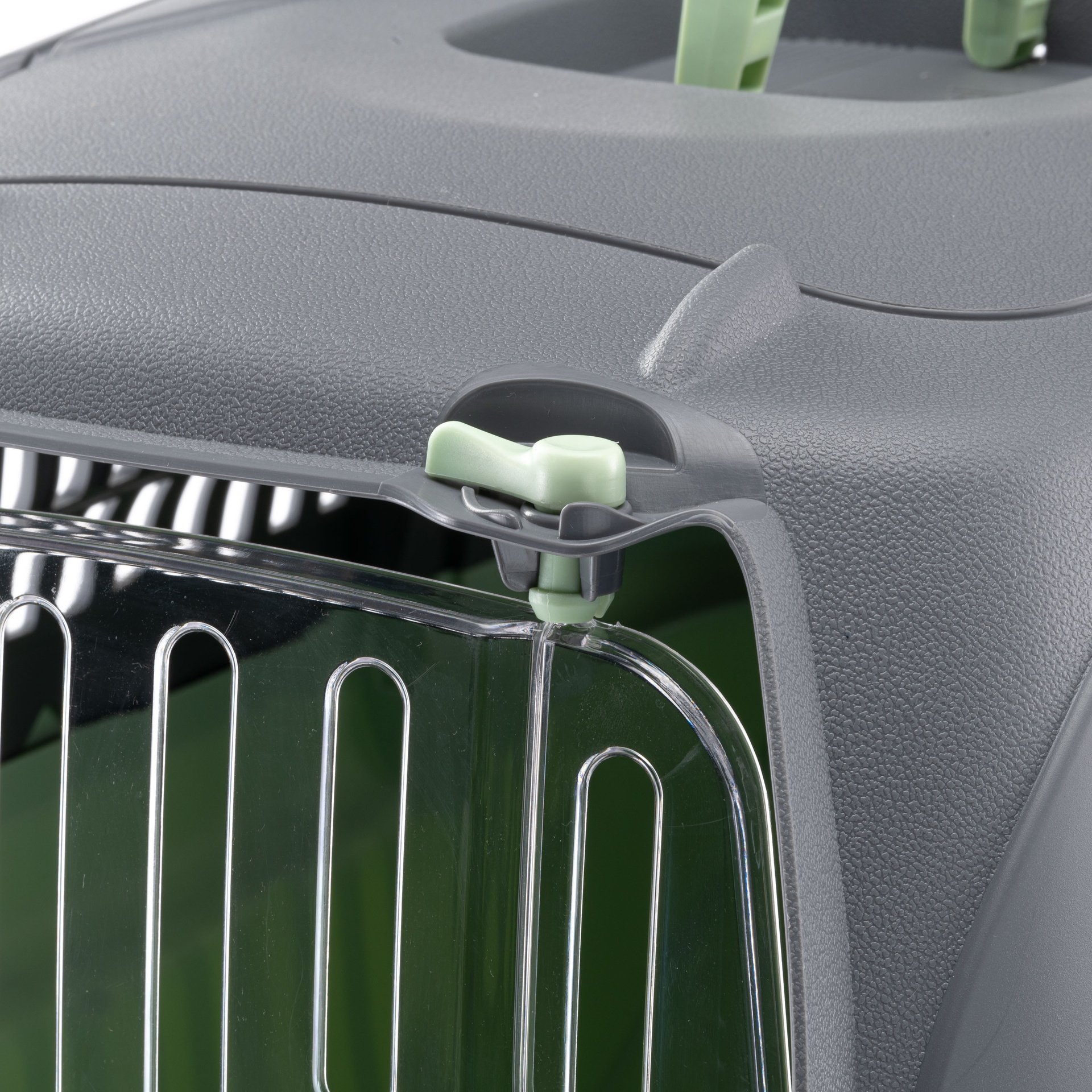 Transparent, impact-resistant door with ventilation holes, allowing visibility of your animal inside
