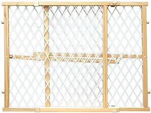 This gate is made with a durable, solid hardwood frame with plastic mesh. Expands from 26″-42″ wide standing 24″ high. No assembly is required for this pressure mounted gate. Will not damage walls.