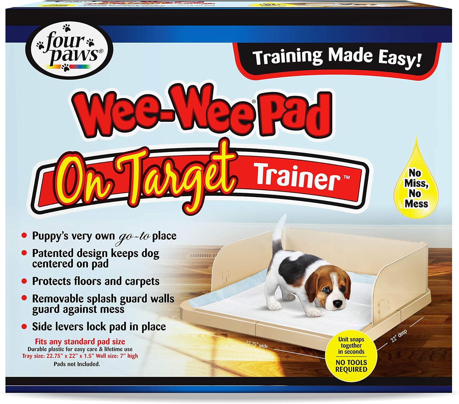 Our Paws Wee Wee Pad On Target Trainer features a patented design to teach your puppy where to do his business. A high three-sided wall keeps puppies centered on the pad and prevents messes from puppies who haven’t quite mastered their – ahem -functions.Keeps puppies centered on pad & protects floors & carpetsHelps speed up housetraining by providing puppies with a “go-to” placeEasy, convenient & efficient 4-piece constructionThe Wee Wee Pad On Target Trainer’s splash guard walls can be removed when your puppy gets larger or no longer needs the extra mess protection. Easy-to-use clips will hold any standard size Wee Wee Pad securely in place.Tray Size – 22.75″L x 22″W x 1″ HWall Size – 7″ High