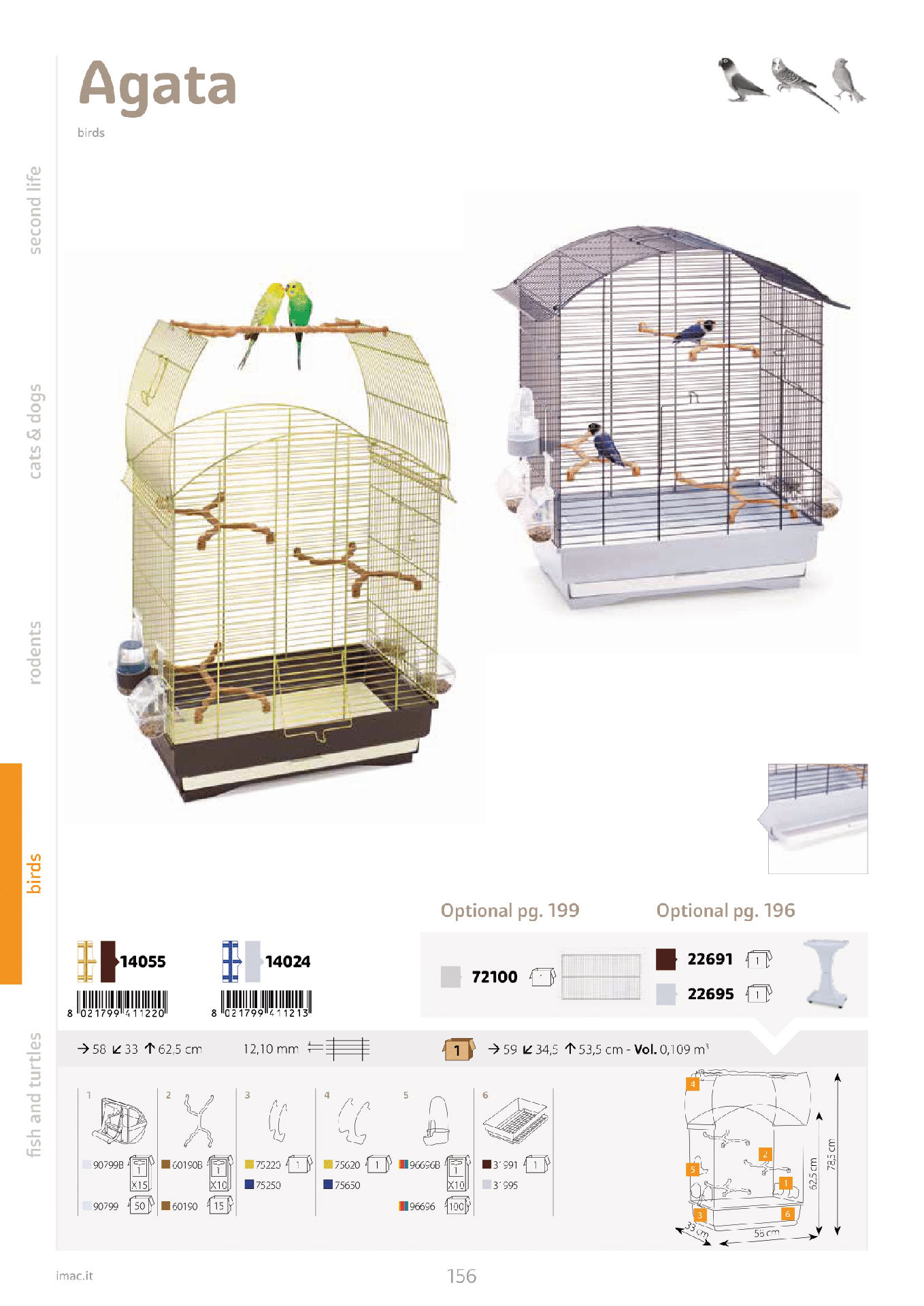 Beautiful and welcoming, Agata is the rectangular cage that offers ample space for canaries, parakeets and small exotic birds. Blue painted mesh structure combined with a blue aviation plastic or brass-plated bottom and a dark brown background for the more classic version. Attention to detail, the Agata cage is equipped with a handle for easy transport and a large front door with vertical opening and a smaller side door, for easy access for any need. Placing the perches in the shape of a branch on the sunroof, your feathered friend will have a real panoramic terrace, from which he will be able to observe the surroundings. For a very practical cleaning of the cage, pull out the drawer on the bottom and you can easily remove the bag daily. The accessories that complete this cage meet all the needs of your little bird: four Mia troughs in transparent plastic, a Tweety 100 drinker and four branch-shaped perches that allow you to vary the grip of the legs continuously, making them similar to the use which is found in nature. Try the very comfortable optional Cage Port 226 to be combined in aviation blue or brown, to move the Agate Cage without difficulty, thanks to the swivel wheels.
