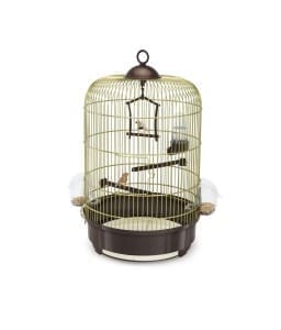 Practical and elegant, Milly is a small round cage for canaries and other small birds. The structure in white wire mesh is combined with the peach-colored plastic bottom, while the one with a brown background.
