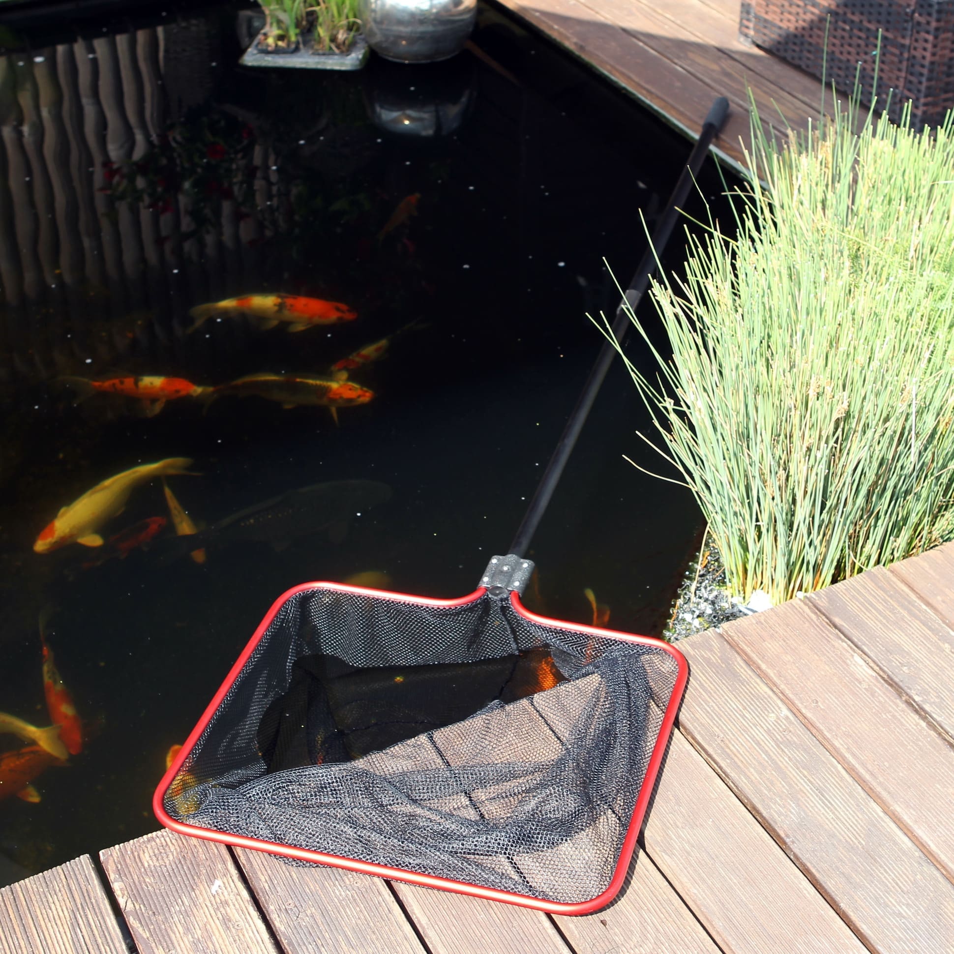 Fine-meshed net with 160 cm telescopic handle . For catching pond fish gently with soft, fine and black net. Also suitable for collecting leaves