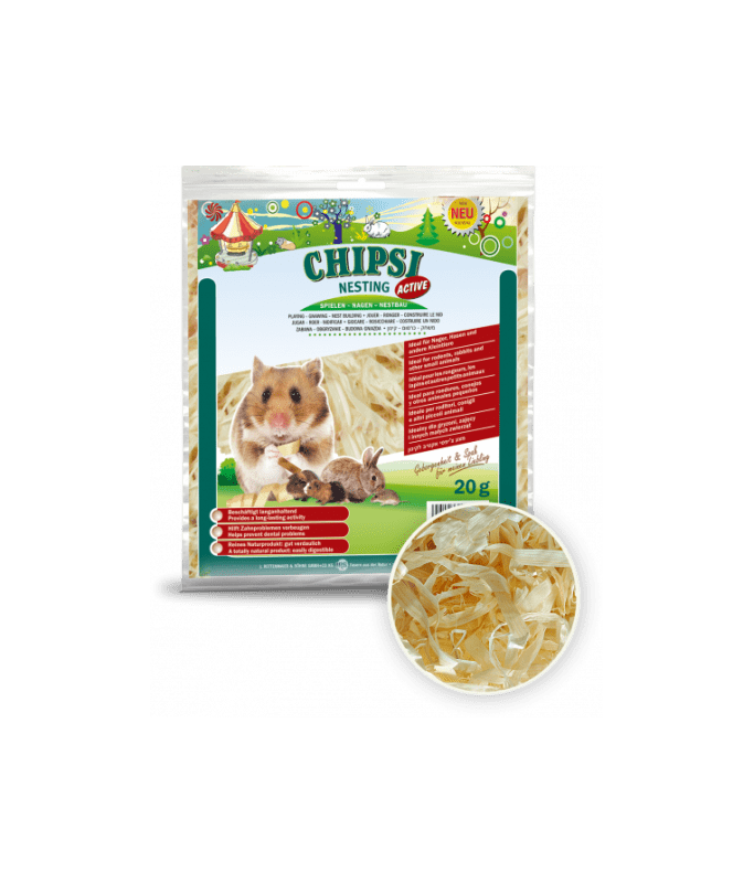 Game without limits!With CHIPSI NESTING ACTIVE the animal is really stimulated to play. CHIPSI NESTING ACTIVE promotes game play, motivates gnawing, nest and tunnel construction and ensures a feeling of security all round. Due to the broad, loose structure of the plant fibers, CHIPSI NESTING ACTIVE is ideally suited for the sensible and long-term employment of rodents. Advantages that convince •Plant fiber curls for playing, gnawing, nest building •promotes the play instinct •busy for a long time  •almost dust-free •easy to digest •prevents dental problems