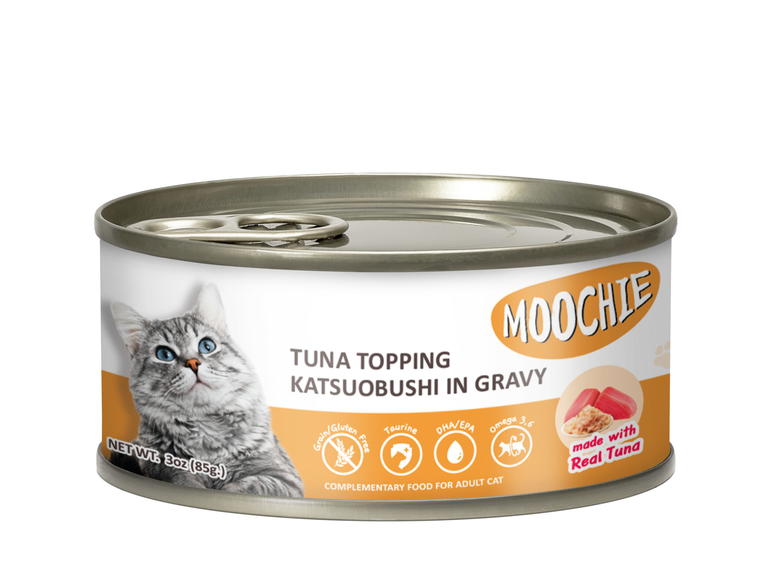 Moochie Adult Tuna Topping Katsuobushi is a premium cat food that comes in an 85g can. This recipe features real tuna as the primary ingredient, along with Katsuobushi & tuna that is commonly used in Japanese cuisine.