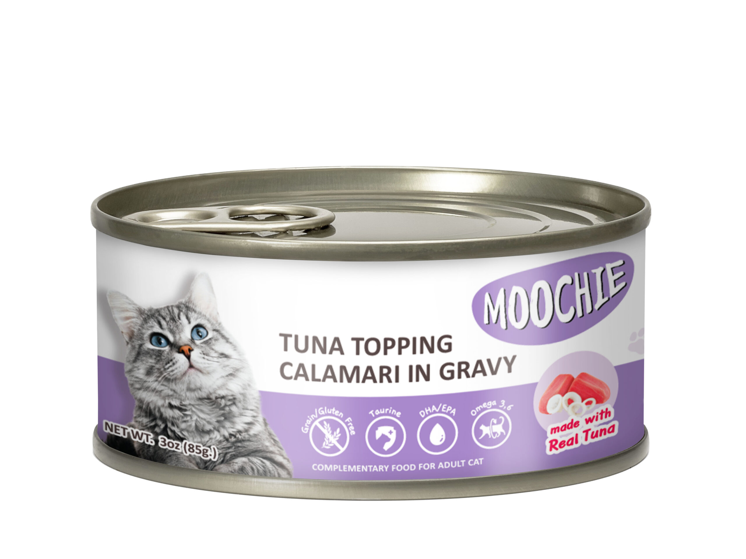 Moochie Adult Tuna Topping Calamari 85g Can is a type of wet cat food that is formulated for adult cats. It comes in an 85 gram can and is made with real sardines.