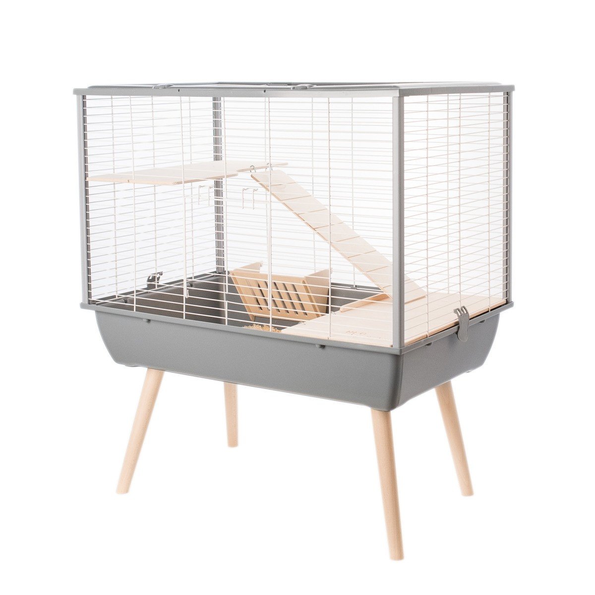 Trendy cage for large small animals designed on wooden feet. Adapted to each breed: bars are spaced according to the animal. Raised cage and levels provide animal a wider view of the environment. Large opening on the top and on the front to easily catch the animal. Finishing touches: solid wooden legs and “NEO by ZOLUX” is engraved on the first level. Made in Europe.