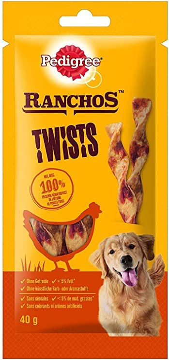 Pedigree Ranchos Twists 40g are soft, chewy dog treats crafted with 100% fresh chicken breast intertwined with chopped rawhide, providing a satisfying texture and rich flavor that dogs love. These grain-free treats contain no artificial colors or flavors and have less than 5% fat per 100g, making them a healthy option for your canine companion.