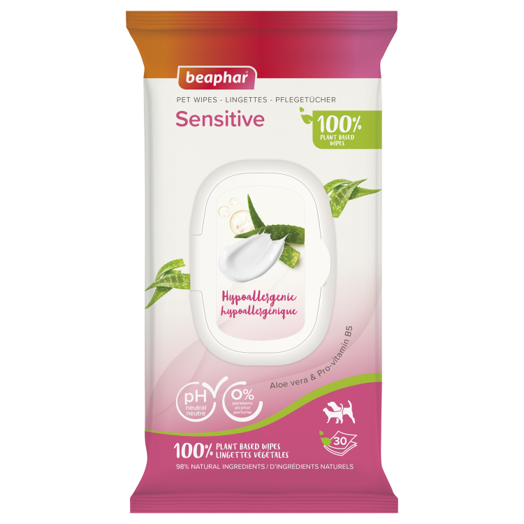 Beaphar Pet Wipes Sensitive are wet wipes for pets with a sensitive skin, puppies and kittens. The wipes are made from 100% plant based viscose and contain lotion made with at least 97% natural ingredients; the wipes are delicately infused with Aloe Vera and Pro vitamin B5 and they are hypoallergenic without any perfume. The wipes are softening and moisturizing and respect the natural pH of the dog’s or cat’s skin. Each package contains 30 wipes and is easily recloseable. The wipes are biodegradable too.