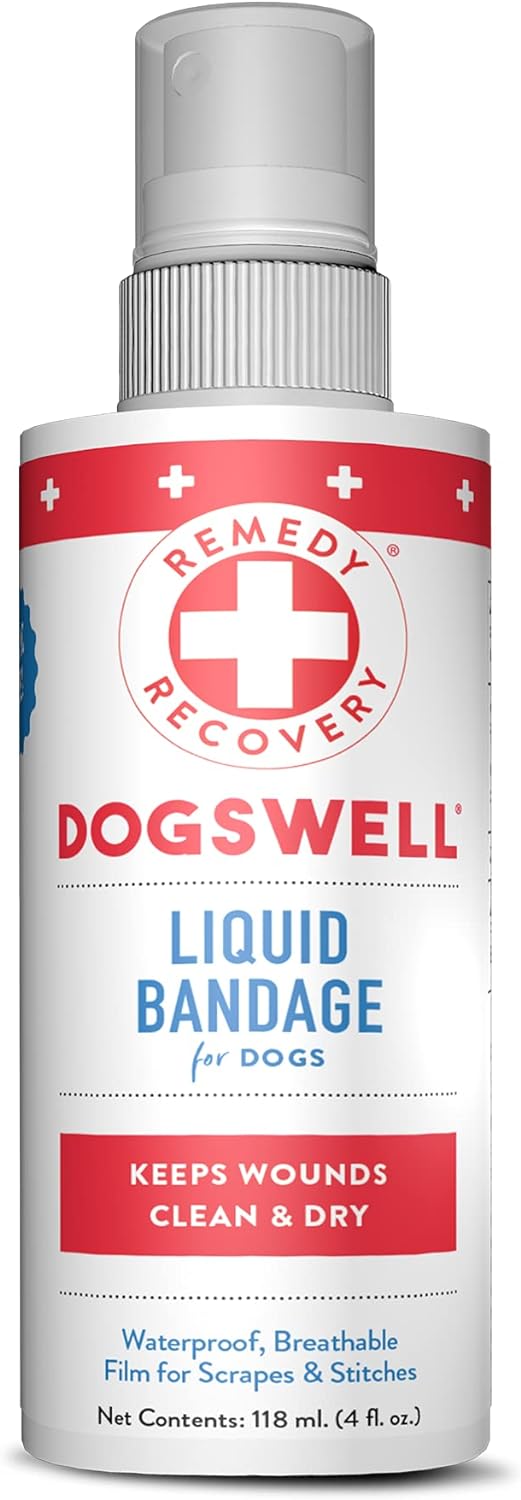 Dogswell Remedy + Recovery Liquid Bandage is a medical device created to help heal and protect your pet’s injury, keeping it clean and dry. Its easy spray application dries quickly and begins to soothe instantly. It contains no alcohol so there is no worry that it will sting or cause your pet discomfort. Soothing aloe and chamomile calm redness and irritation. This polymer-based film is breathable to promote healing and contains no acrylic (plastic).