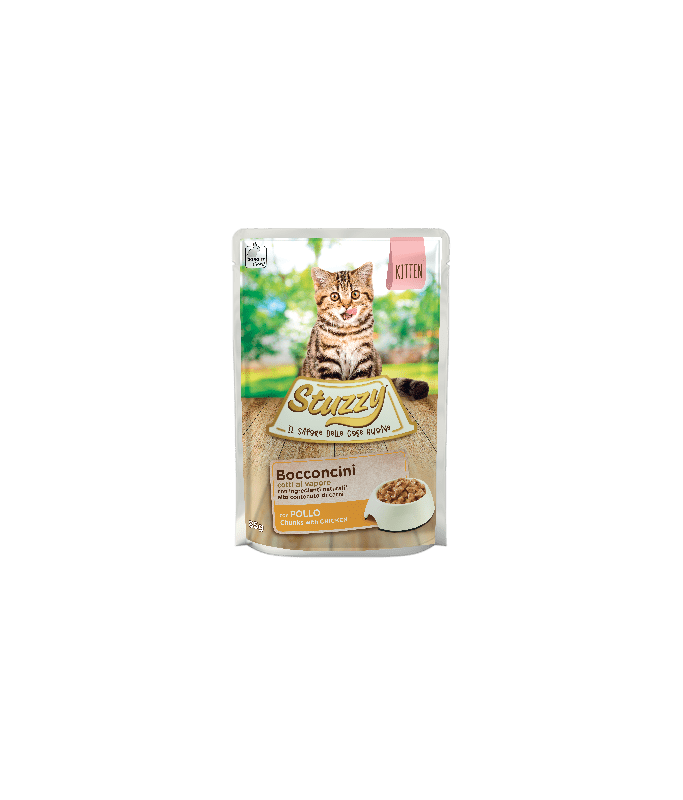 A complete recipe studied for your kitten: Stuzzy  cat Chunks with Chicken are prepared with natural ingredients and a high meat content to offer the best in terms of flavour and nutrition, to watch him grow strong and happy.