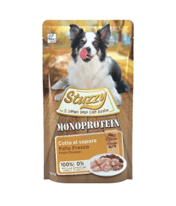 Stuzzy Monoprotein Chicken is the complete meal for dogs you are looking for to feed your champion an inviting meal containing a single source of animal protein. Steamed to preserve the genuine quality. Try it in the convenient 150 g pouch.