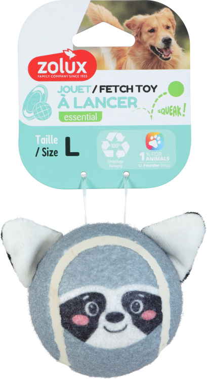 Tennis ball with raccoon print, designed for fetch and chew activities.