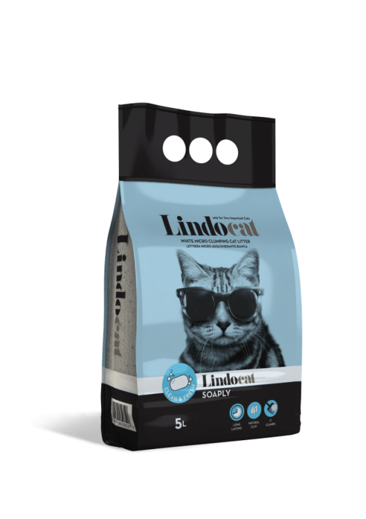Lindocat Soaply is a high-quality hygienic clumping litter made entirely of excellent bentonite clay in fine white granules, enhanced by the presence of blue granules. The small-sized granules facilitate rapid clumping and the formation of solid lumps together with less product waste. Delicately scented with a selection of precious essences, Lindocat Soaply is the ideal litter for those who love a clean and fresh fragrance.